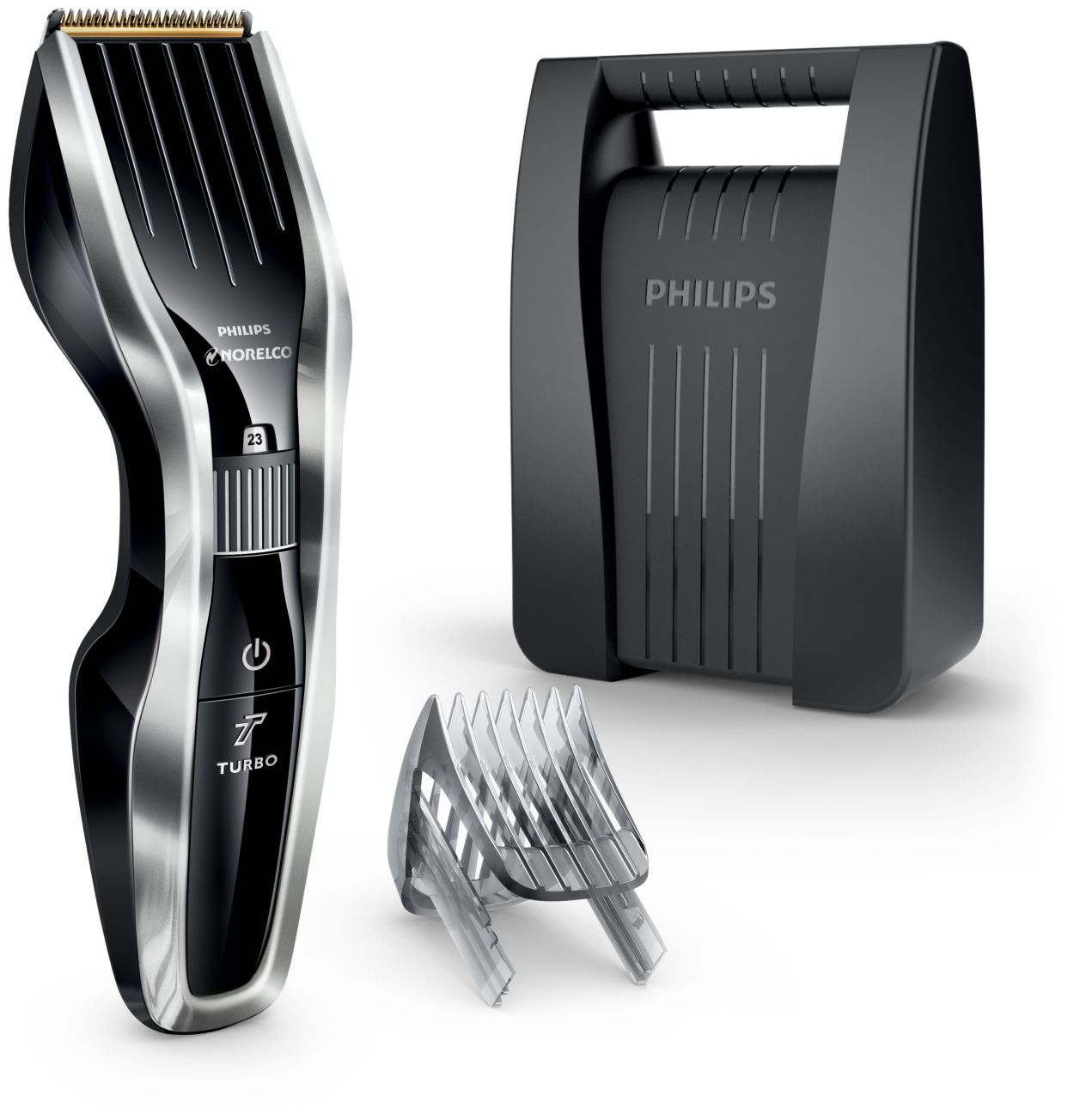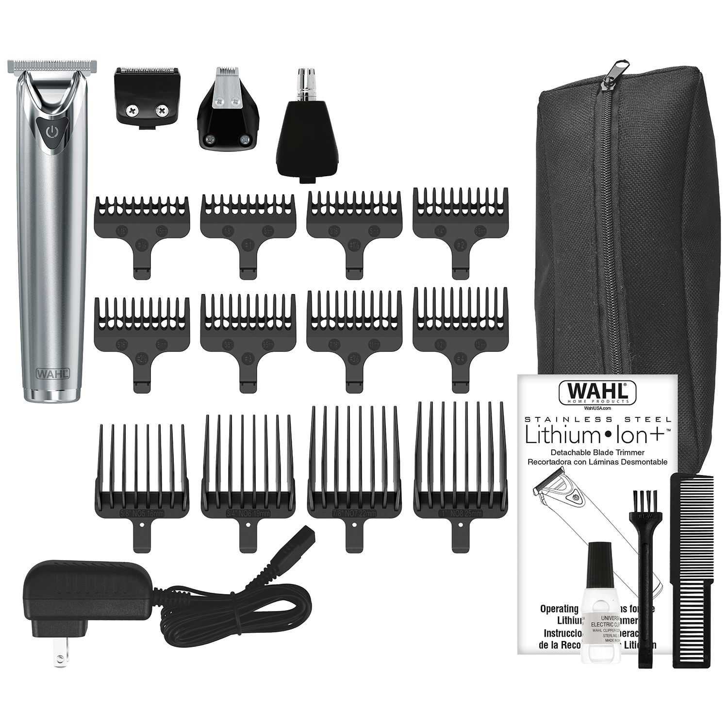 It includes 14 guide combs trimmer heads in three widths a small foil shaver head and a nose hair trimmer.
