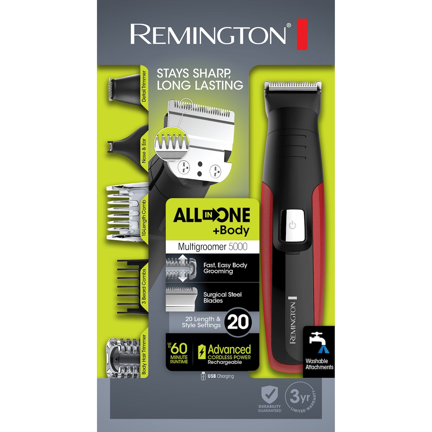 The fully washable attachments enable you to trim detail or shave any unwanted hair. Lithium all in one grooming kit remington tackle all your styling and trimming needs with the remington lithium all in one grooming kit 3600 series. The lithium battery inside the rechargeable power base drives the self sharpening surgical steel blades to deliver precise and comfortable trimming.