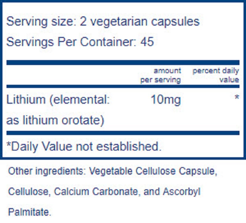 Vital nutrients offers low dose lithium supplied as lithium orotate a bioavailable salt. Lithium supports the phosphoinositol pathway. 1 capsule daily or as directed by your healthcare professional.