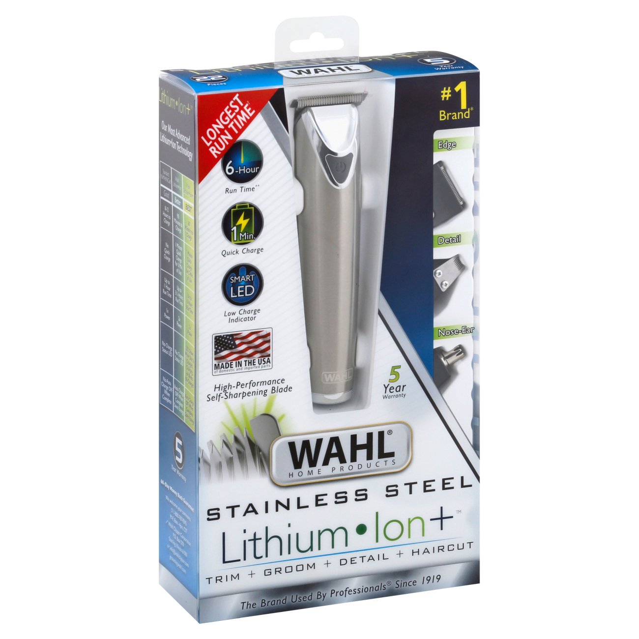 Wahl lithium ion all in one rechargeable. 7 guide comb and head attachments allows for a wide variety of cutting lengths 5 year warranty. Lithium ion multigroom wahl usa this beard trimmer is powerful quiet lightweight and designed to speed up your grooming time.